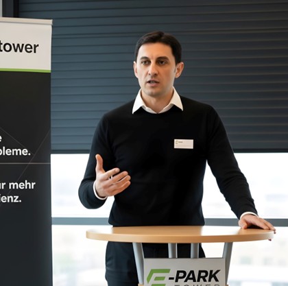 Presenting his latest infrastructure venture: a compact vertical system integrating structured parking capacity and EV charging for high-density urban environments.